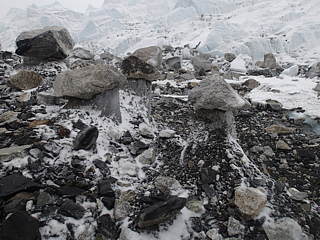 川筋に沿って上流に向かうと、このように氷の柱の上に石を載せたものをあちこちで見掛けます。これは雨によって石のないところの氷が侵食されたために残った形ですが、中には「あれが崩れるときにその場に居合わせたらただではすまないだろう」と思うほど大きなものもありました。