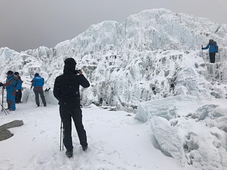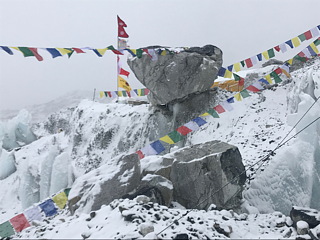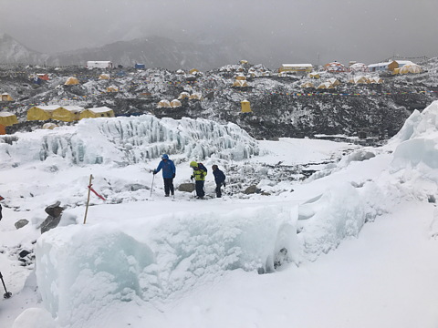 登路は赤い旗で示されていて迷う心配はありませんが、ここから先に進むことはパーミッションの関係でできないため、我々は周囲の氷の地形の中を散歩するだけにとどめました。晴れていればアイスフォールを間近に見上げることができたでしょうが、この日の天気でそれが叶わなかったことだけが心残りです。