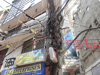 しかし、これは地震の影響なのかそうではないのか不明(たぶん違う)ですが、カトマンズの町の混沌とした様子には圧倒されました。宿泊したフジホテルがパックパッカーの聖地とされるタメル地区にあることから、狭い車道とその左右に縦横に走る細い路地に面して旅行者向けの店がこれでもかというくらいに並ぶ複雑怪奇な街並みのために、うかうかしていると迷子になってしまいそうになります。そしてその狭い道を歩くと、もうもうと立ち込める土埃(?)にびっくり。あらかじめ注意を受けていましたが確かにこれはマスク必携です。さらに、まるでスパゲティのように絡み合っている電線にも強烈な印象を受けました。これはメンテナンスを放棄して次々に新しい電線を張り足していった結果で、したがって生きている電線はこの内の数本にすぎないと思われるのですが、よくこれで漏電や感電事故が起きないものです(それとも起きているのか?)。