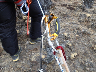 また、私はこのアッセンションを手持ちのデュアルコネクトアジャストの短い方のアームに取り付け、長い方のアームとスリングとをランヤードとしてヴィア・フェラータの要領で使用しましたが、スリングよりもPASの方が取り回しが良かったかもしれません。一方、下降器としてATCではなくエイト環が推奨されているのは、ロブチェ・イーストからの下降時に使うフィックスロープの径に柔軟に対応できるためです