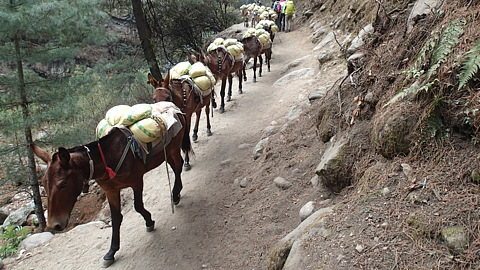 ルクラからエベレストBCに至るエベレスト街道は、車が走れる道ではありません。このため、この幹線ではさまざまな運搬手段を目にすることになります。