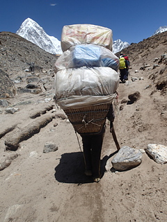 お金に糸目をつけなければ、最も機動力のある運搬手段はもちろんヘリコプターです。道中の主要ポイントには必ずヘリポートがあり、天候が許す限り1日のうちに何度も往復している姿を見ることができます。そしてその最重要な役割は、高山病に罹患した登山者を下界に降ろすことではないでしょうか。しかしお金持ちのためのツアーではヘリコプターを主要な移動手段として積極的に用いるプランも見受けられ、中には、旅の9日目にカラ・パタールまでやっと辿り着いたと思ったらその日のうちにゴラクシェプからカトマンズへ直接ヘリコプターで帰るというツアーがあって、しかも飛行時間はたったの1時間半だと書かれていて仰天しました。