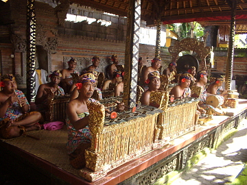 まずはウブドからいったん南下し、バロンダンスのメッカであるバトゥブラン村の劇場に入りました。劇場といっても、客席には屋根があるものの舞台はオープンエアで、中央奥には割れ門、下手にガムランの楽団の座敷があり、役者たちは奥の割れ門から現れて正方形の舞台上に繰り出す仕組みです。我々が会場に入ったときは客はほとんど入っておらず、最前列のうまく日陰になる位置を占めて開演を待つことができました。後から西欧系やアジア系のお客が三々五々入ってきましたが、最初から切れ目なくガムランを演奏し続けている20人ばかりの奏者たち(縦笛1人を除いて皆打楽器)が手元を見ずに客席ばかり見やって「今日も客が少ないな〜」という顔をしているのが笑えます。やがて、それ以上の客の入りを諦めたように開演しました。