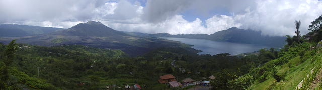 しばらく景観を楽しんでから車に戻り、さらに北へ進みます。道はどんどん高度を上げ、やがて見晴らしの良い場所に出たらそこがバリ島きっての景勝地であるキンタマニでした。巨大なカルデラの中央火口丘が標高1717mのバトゥール山、外輪山の東側にある最高峰が2153mのアバン山で、この間にとても大きなバトゥール湖が広がるなかなか雄大な眺めです。18年前のかすかな記憶ではカルデラの中はもっと荒涼とした雰囲気だと思っていたのですが、いまこうして見るバトゥール山周辺は緑が豊かで、バトゥール湖の周囲にはホテルやレストランも建ち並んでおり、ずいぶん印象が違っていました。ただの記憶違いなのか、それとも18年の間に環境が変わったのか……。