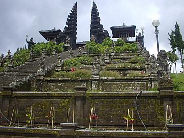 食事を終えたら車に乗って、今度はキンタマニの東南に位置する聖峰アグン山南麓のブサキ寺院へ向かいます。途中の山道はよく整備されていて、バトゥール湖がますます大きく立派に見えるようになりましたが、あいにくアグン山は雲に隠れて姿を見せてくれません。アグン山は標高3142m、バリの人々の精神的な中心地で、伝統的な方角は東西南北ではなくアグン山方向(カジャ=清浄な方角)とその反対(クロッド=不浄の方角)となっているほど。そのアグン山のてっぺんに登るツアーもあるのですが、バリ島の人々は聖なる山の頂に外国人たちが土足で立つことにどういう感情を持っているのかが心配になります。それとも昔から講中で登られている富士山のようなものなのかな?