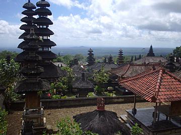 ブサキ寺院はバリ島のヒンドゥー教の総本山で、16世紀から本格的に栄えた由緒ある寺院です。アグン山の手前の斜面にいくつかの小寺院を細胞のように集めた複合寺院の姿をしており、正面中央には背の高い割れ門、その奥にはこれも背の高い、そしてたくさんの塔(メル)が建ち並びます。我々のような観光客は境内に入ることはできず、各小寺院の間を走る通路のような坂道を巡るだけですが、ちょうど地元の人々が祭礼に訪れている様子を門から覗いたり、塀越しに塔やお堂を見ることができました。そして正面の割れ門の右側の階段を登って坂道を突き当たったところにある展望台からは広い寺院の全体像やその向こうに広がるバリ島東部の広闊な眺めを見やることができて、自然に心が落ち着いてきました。