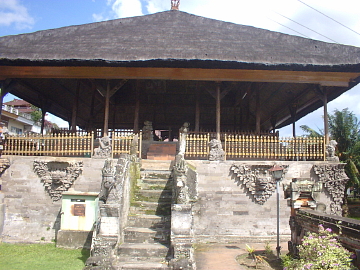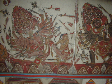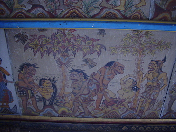 ブサキ寺院から南へ、美しい村々や田園風景を通り抜けながら標高を下げていくと、バリ島東部の古都スマラプラに到着しました。ここは、16世紀にイスラム勢力によってジャワ島を追われバリ島へ移住したマジャパヒト王国の人々が立てたゲルゲル王朝が分裂した後、その直系として18世紀から20世紀までバリ島の正統王朝の地位を守り続けた都です。市街の中心にあるのがスマラプラ宮殿で、まずは中央に池がある四角い敷地の角にある裁判所クルタ・ゴサに登ってみました。1段高いテラスの上に大屋根をかけた構造のクルタ・ゴサの中央にはテーブルをはさんで三つずつの装飾の細かい椅子が置かれており、3人の僧侶がここで裁判官をつとめていたそうです。またここの特徴は天井画で、裁判所らしく罪と罰に関する数々の恐ろしい絵がカマサン・スタイルで描かれています。