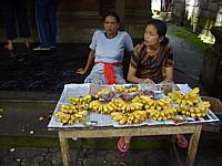 モンキー・フォレスト通りの南の突き当たりに高い樹林の公園があり、それが野生猿の保護区であるモンキー・フォレストで、入口で入園料を払いバナナを買って中に入るとすぐに毛並みのいい猿たちに出会うことができました。彼らは人によく慣れていて、観光客がカメラを向けても一向に気にしませんし、こちらがバナナを持っていると見るとすたすたと近づいてきて膝の辺りにしがみついてバナナをせがみます。仕方なく1本分け与えると次の猿が近寄ってくるという具合ですが、中には図々しいやつがいて片手にバナナを持っているのにさらに1本せしめようとにじりよって来るので「お前もうもらっただろ!」とマジ切れして追い払いました。