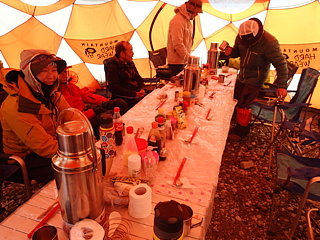 中央のひときわ大きなまだらのテントが全員入れるダイニングテント、そしてその周囲の黄色いテントは寝泊まり用のテントです。後者は、エベレスト隊員とロブチェ隊のうち個室料金を払っている者は1人使用、残りの隊員は2人1組で使用します。
