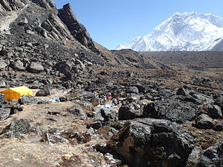 帰幕したら大テントで昼食となりましたが、自分ははっきり食欲が減退しています。これは困ったなと思いましたが、一方でうれしい出来事はトコちゃんのひと足遅れの合流でした。先に書いたように、トコちゃんは旅の最初の頃はエベレストに自分も登る気満々でしたが、もはや「ここまででもえらいわー。エベレストなんてありえへん」と達観した様子。それでも持ち前の明るさが隊の雰囲気を賑やかなものにしてくれるのですから稀有なキャラクターです。