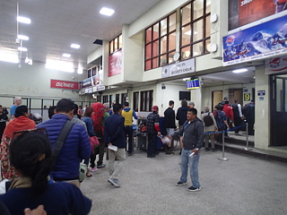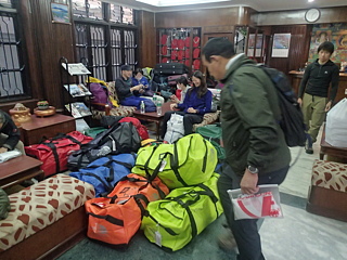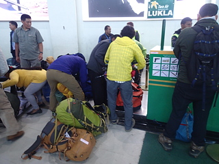 早朝、空港へ送ってくれた運転手さんは我々が車を降りるときに「オムマニペメフム」とチベット語の六字真言を唱えてくれましたが、我々の前にはまず最初の難関が控えています。実は、ルクラへの国内線には機内持込荷物3kg以内、預け荷物13kg以内と、登山装備の携行が必須の我々から見ればすっとこどっこいな重量制限が課されていて、そのため皆、荷物を極力切り詰めて日本を発ってきているのですが、それでもなんだかんだで重量制限は守れそうにありません。しかし、そこには何やら超法規的な響きのする「ネパール・マジック」というものが存在するらしく、空港での計量は無事にパスしました。