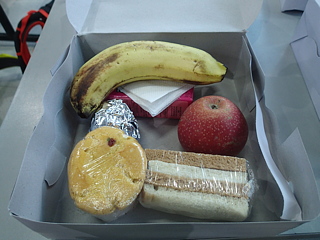 やれうれしやとお弁当箱を開けた途端、我々の搭乗手続が開始されてしまい、皆はあわててお弁当を手に列に並びました。ただし、一度に搭乗できる人数の都合でいっしーと私は2便目となってしまいましたが、おかげで朝食をゆっくりとることができました。