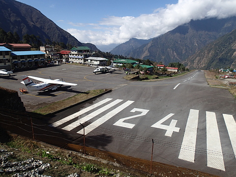 カトマンズからルクラまではおよそ30分間のフライトで、飛び立ってしばらくすると左手に雪を戴いた高峰の連なりが見えてきてテンションが上がります。見えている中には霊峰ガウリシャンカール(7134m)も含まれているのかもしれませんが、残念ながら山座同定不能。それよりも、有視界飛行で飛ぶ飛行機が高度を下げた先に見えてきたルクラのテンジン・ヒラリー空港の滑走路の異常な短さ(460m)が気になります。えっ、たったあれだけ?と思っているうちに飛行機はその短い滑走路の先端に向かって降りていき、そして無事に着地しました。そのとき初めて気が付きましたが、この滑走路は谷側から山側に向かって12%の上り勾配に作られていて、着陸時には重力の力も借りて減速する仕組みになっていました。