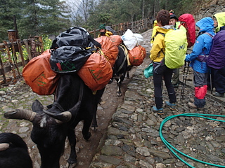 川を渡る吊り橋、荷物を運ぶゾッキョ。これからのトレッキングで毎日出会うものたち。すれ違うときは動物優先です。