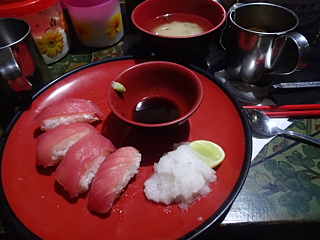 この日のサプライズは、夕食に出てきたまさかの握り寿司でした。なぜか寿司とは別にご飯が出てきたのは意図不明の献立ですが、各種野菜を使った小鉢がぞろぞろ出てきたのも、デザート代わりにマスカットが出てきたのも、いずれも驚きです。そして食後には、この旅で最初のパルスオキシメーターによる計測が行われました。この日から毎日、夕食後と朝の起き抜けに血中酸素飽和度(SpO2)と脈拍とを測ることが日課となります。