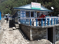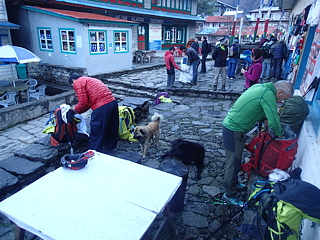お粥とホットケーキというこれまた不思議な組合せの朝食をとってから出発準備にかかっていると、とても人懐こい犬2匹が我々の周りをうろうろ。カトマンズやルクラではいかにもやる気がなさそうに寝そべっている犬ばかりでしたが、ここから先で見掛けた犬たちはおおむね活動的で、後で記すように、驚くような場所にまでついてきたりしていました。