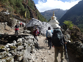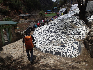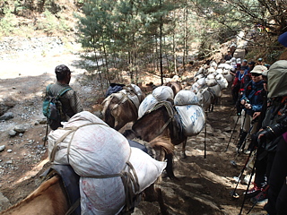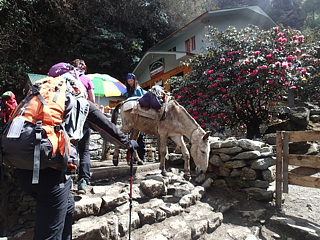 マニ石、チョルテン、荷を運ぶロバ、ネパールの国花であるシャクナゲ。路上にはいたるところに動物たちの糞。我々にとってはトレッキング道であるこのエベレスト街道も、元来はチベットとの交易路であり、この地方に住む人々の生活路でもあります。