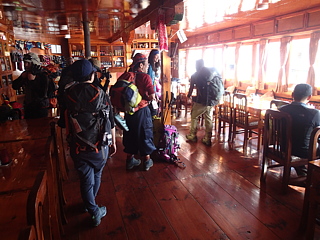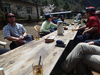 食後にはネパール・スタッフの紹介がありました。向かって左端の堂々たる体格の人物が、今回の隊のネパール側代表であるプラチリ・シェルパ。笑うと金歯がキラリと光ります。そして後に我々が「プラチリ団」と呼ぶことになるこの隊は、高所ガイド、キッチンスタッフ、ポーターからなり、写真の高所ガイドはいずれも8000m峰登頂経験を有する強力なメンバーたちです。特にプラチリの隣のパサン・タマンとその隣のチェパ・シェルパには、この後の旅の行程を通じてロブチェ隊のメンバーもずいぶんお世話になりました。また、キッチンスタッフのヘッドはバル・バハドゥール・ライですが、この職種区分はずっと固定であるわけではなく、例えばチェパがそうであったように、ポーターからキッチンスタッフへ、そしてガイドへと進む昇進ルートがあるようです。