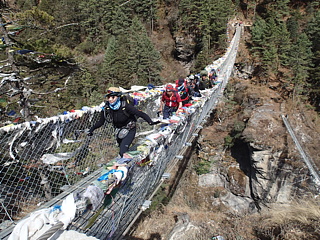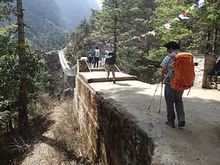 今日のトレッキングは、ドゥード・コシ(「コシ」は「川」の意)に掛かる吊り橋を左岸から右岸へと渡ることから始まりました。こうした吊り橋をこれから何度も渡ることになるのですが、いずれも金属でがっちり作られており、揺れはするものの安心感があります。それもそのはず、この吊り橋は荷物を目いっぱい背負ったロバやゾッキョ、ヤクの隊列が一度に渡ることもできる強靭さを備えているのです。