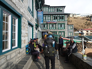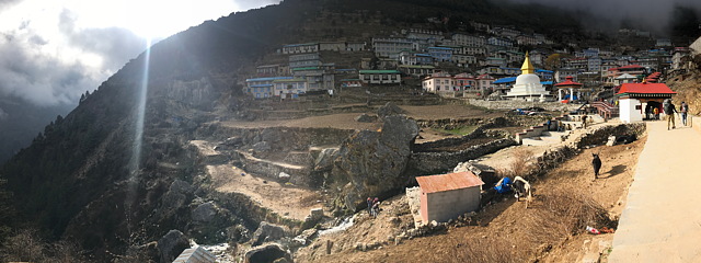 これがかの有名なナムチェバザールの入り口で、先ほどの二俣からは標高差500m強を一気に上がってきた計算になります。