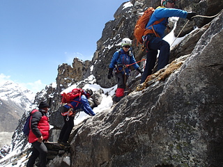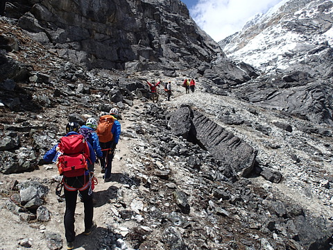 見上げると山頂方面は黒っぽい雲に覆われて見通せませんが、ちょうどそのとき、上部での工作を終えたパサン・タマンとチェパがにこやかな表情で駆け下ってきました。すぐに我々と合流した彼らはバラサーブに上部の状況を伝えている様子ですが、見えている範囲内では氷化している場所はないように思えました。