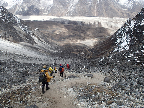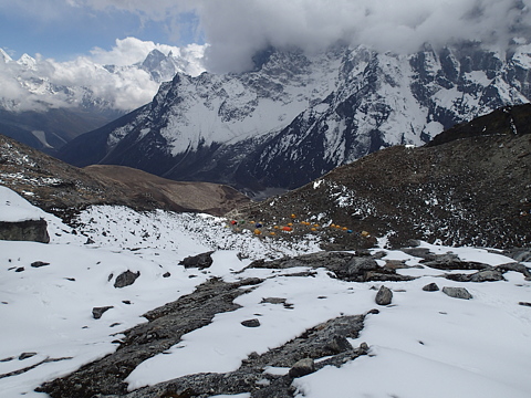 さらに鞍部の向こう側を見下ろしてみると、そこにはテント村が見えています。実は、ロブチェ・イースト登攀の本来のBCはこちらの谷の下で、見えているテント村はそこからのルート上のHCなのですが、ここをHCとしたのではアタック時の高距が大きくなり過ぎるという判断で、AG隊はさらに高いところにHCを設営することとしているようです。