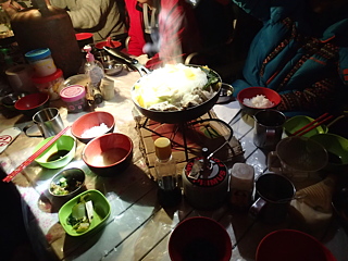 夜は豪勢なすき焼き(肉は豚)。最後は日本風におじやにして食べられるだけ食べ、翌日の粗食に備えました。私は食欲がまだ衰えたままなのですが、ここにきてもエベレスト隊のかっつんとヒロくんが無限の食欲を発揮していることには感嘆しました。