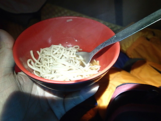 午前4時に起床するとすぐに朝食の蕎麦が配られましたが、食欲は問題なく、おいしくいただきました。配布された行動食は、これも食べやすさ重視でアミノバイタルゼリー、キットカット、柿の種の小袋です。