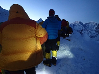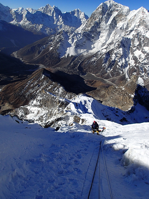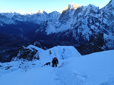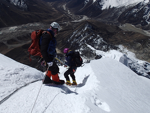 10時前に下山開始。それぞれガイドがついて確保された状態で下っていきましたが、私は「空いている別のフィックスロープを使ってエイト環で下るように」とのプラチリの指示を受け、自分のペースでとっとと下ることになりました。しかし実際に下り始めてみると恐ろしいほどの疲労を感じていて「とっとと」というわけにはいきません。たぶんシャリバテに加えて高度の影響がこういうかたちで出たのだと思うのですが、今まで長年登山をしてきてこれほどの疲労を感じたことは数えるほどしかありません。