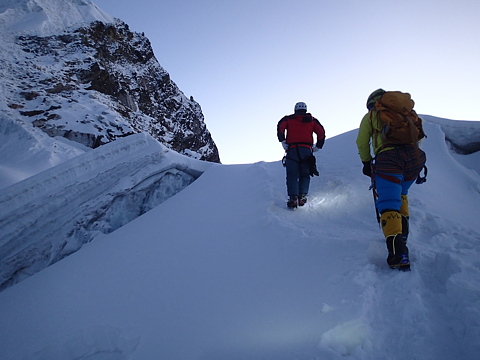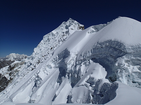 ロブチェ・イーストの本当の山頂はあちらのはずですが、確かにこの雪の状態ではこれ以上近づくのは難しそう。さらに、エベレスト隊はここで高度順応のために1泊する予定だったのですが、本来は平坦になっているはずの肩にもクレバスができており、この日のうちに全員でBCまで下ることになりました。