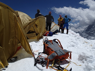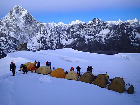 ところが、最後の斜面を下っている途中で不意に咳き込んだとたん強い嘔吐感に襲われました。そこで吐いてしまってももちろんよかったのですが、どうせ胃の中には何も入っていないので吐いても吐かなくても同じこと……と考えてここは我慢。そうした状態でどうにかBCに帰還したときには15時を回っていました。乏しい行動食しか口にしていなかった一同にはすぐにそうめんが振る舞われ、そのまま皆はダイニングテントでロブチェ・イーストに登れた喜びを語らいあっていたようですが、私は就寝用テントのシュラフに潜り込んで身体を休めることにしました。