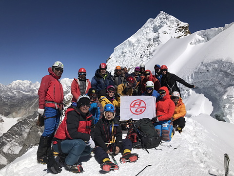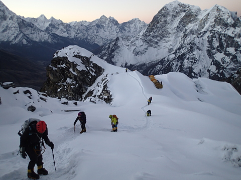 どうやら我々が到達したのは、山頂手前の肩の突端にあたる標高5950m地点であった模様で、おそらくここがこの時点での「認定ピーク」扱いだったのだと思われます。この点についてはWikipediaにもAs the easier, trekking peak, the East peak is climbed far more frequently than the West peak; however, most of those climbers only do so to a false summit a few hours from the true summit of Lobuche East.