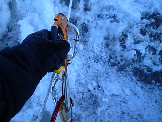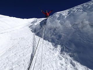 プラチリから指示が出て、いよいよアッセンダーの出番となりました。ただしこれは安全確保の手段であり、自分の身体を高みへと運ぶのはあくまで自分の足です。
