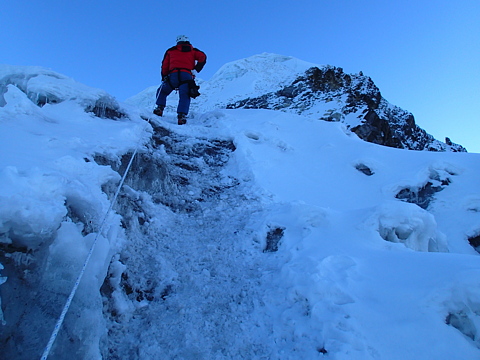出発から2時間余りがたち、フィックスロープ残り1ピッチ分にゴールが近づいたところで振り返ると、今度はヒロくんが泡爺を抜いており、しかも素晴らしいスピードでぐんぐん迫ってきます。いやー、これは抜かされるな、と思ったときに不意にスリップ!見れば私の左足のアイゼンがオーバーシューズから外れていて、これで万事休すです。プラチリがあわてて戻ってきてアイゼンの再装着を手伝ってくれている間に、ヒロくんは横をすり抜けていきました。