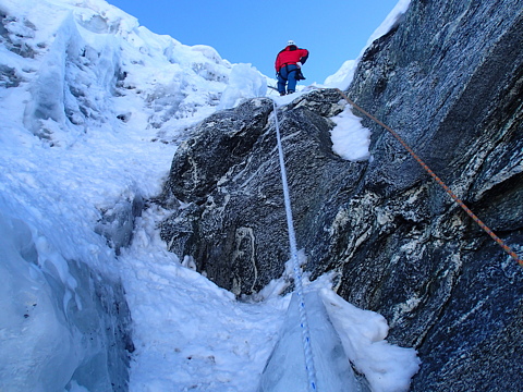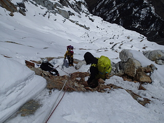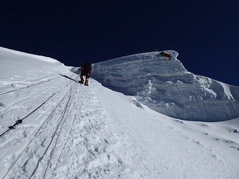 HCからの下降もつらいものでしたが、やはり下るにつれて空気が濃くなってくるせいか、徐々に体調が回復してきました。ところどころの岩場を慎重に下り、やがてアイゼンを装着した台地に着いて一休み。ここで靴も衣服も身軽なものに交換し、最後の岩場をフィックスロープにランヤードを掛けて通過すればほぼ安全地帯です。