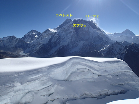 向こうにはエベレストとローツェが、ヌプツェ越しに見えています。また、目を左に向ければ近くにはプモ・リ、ローツェの右側に視線を転じればマカルー、ぐるっと右に身体を回すとアマ・ダブラムがすっきりと立っている姿がやはり目立ちます。こうして展望を楽しんでいるこの場所は標高がほぼ6000mのはずですが、まったく息苦しさを覚えないのは、眺めの良さが苦しさを忘れさせてくれているのか、ここまでの高度順応がうまくいった証なのか?たぶん、その両方なのでしょう。