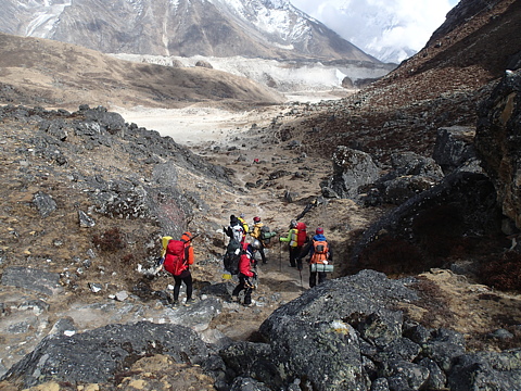 たまに出てくるこうした岩場もよいアクセントとなっています。そして振り返ればタボチェとチョラツェ、遠くにはタムセルクとカンテガが見事にそそり立っています。