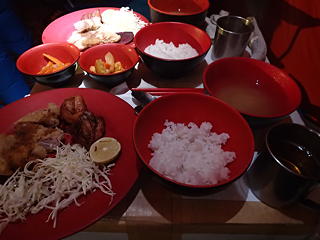 夕食はあたりがすっかり暗くなった20時からで、とんかつとチキンをメインとする豪勢なディナーです。