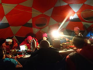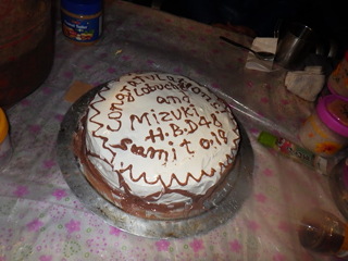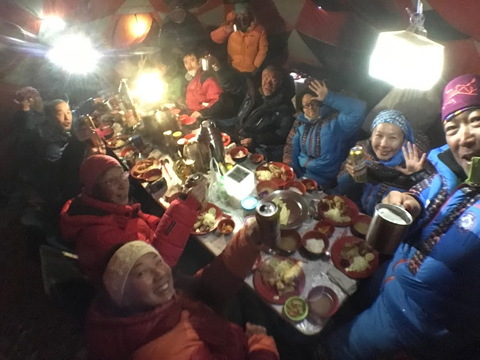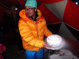 前日が水生さんの誕生日だったので、登頂祝いとバースデー祝いを兼ねたケーキも登場しました。このケーキは絶品で、ビールは受け付けなかった身体もこのケーキはおいしくいただくことができ、またそのことによって元気が戻ってきたような気がしました。そして隊員一同で「Happy Birthday to You」を歌った後には、現地スタッフによって「Resham Firiri」が歌われました。この歌は内容としてはラブソングですが、ネパールで最もポピュラーな愛唱歌の一つとして歌われる機会が多いそうです。