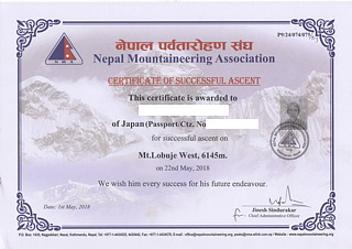 右は登山許可証、下は登頂証明書。いずれも旅の最後にもらいましたが、登頂証明書にはなぜか「Mt. Lobuje West, 6145m」と書かれています。この点に関して、帰国した後にAG社から「正しいものと交換できる」という連絡をもらったのですが、あえてこのままにすることにしました。これも、何事につけてもおおらかなネパールの思い出です。