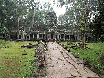 さて、車は雨模様の中まずアンコール・トムに入り、王宮前広場を右に曲がって勝利の門を抜けました。道の左手にトムマノン、右にチャウ・サイ・テボーダの二つのヒンドゥー寺院を見、さらに未完成の寺院タ・ケウの大きな姿を見送ったらタ・プロームに到着です。タ・プロームはジャヤヴァルマン7世が母のために1186年に造営した仏教寺院(後にヒンドゥー教に改宗)で、東西1000m、南北600mの広い敷地内に荘厳な伽藍が残っていますが、その多くが巨大なスポアン(榕樹)の根に巻き付かれ、飲み込まれたままの状態で維持されていました。これは自然の猛威を明らかにするためにあえて修復の手を加えていないのだそうですが、とにかく凄まじい光景です。