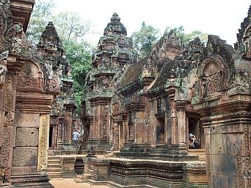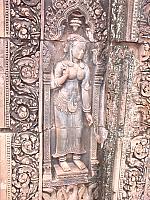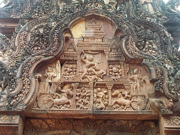 バンテアイ・スレイは967年に建てられた小さなヒンドゥー寺院ですが、赤色砂岩を使った美しい色調と、他の遺跡とは一線を画すほどに洗練された彫刻で有名です。その技術は驚嘆すべきもので、非常に細かい模様が極めて深く緻密に彫り込まれたマハーバーラタやラーマーヤナの一場面、あるいは美しいデバター(女神)像などが素晴らしく、彫刻好きであれば往復3時間かける価値は十分にあると言えます。