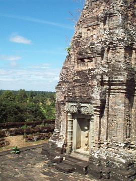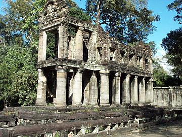プリア・カンはジャヤヴァルマン7世が父王の菩提寺として建てたもので、灯籠が立ち並ぶ西参道を進むと、例によって乳海撹拌のモチーフが欄干に使われた橋を渡りました。中に入ると中央祠堂のストゥーパまで何重かの門をくぐりぬけることになりますが、奥に行くほど少しずつ開口部が小さくなっているので遠近感が出て中央祠堂がはるか遠くにあるように錯覚を起こさせる造りとなっています。また、本来の表参道である東側の北サイドに、クメールでは珍しい(というより他に例がない)円柱で支えられた2階建ての建築物があって、サマニーさんの説明によればここにはかつて聖剣が納められ、夜などには木の梯子を外して盗難を防いだと言うことです。