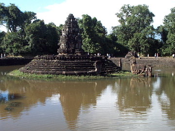 最後に訪れたニャック・ポアンでは、2匹の蛇が円形の基壇を取り巻いた祠堂が四角い池の中央に浮かび、四辺には四種の頭部の像があって、その口から水が小池に流れ落ちるようになっています。この施設もジャヤヴァルマン7世が建てたもので、貧しい庶民が病んだときにここに来ると無料で占い師の診断を受けられ、その結果病気の原因が水なら象、鉄なら人、塩なら獅子、空気なら馬の像の口から流れ出る水を浴びるように指導を受けたとのこと。占い師の施設の跡も残っていました。熱烈な仏教徒であるジャヤヴァルマン7世は、このように庶民向けの施療院を100以上も造ったと言われ、今でも国民に人気の高い王様だそうです。