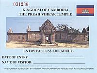 やがて車はカオ・プラ・ヴィハーン国立公園のゲートを越え、わずかに走って土産物屋が並ぶ終点へ到着しました。係員に料金を支払ってトラクターが曳くゴンドラ車(?)に乗り舗装路を500m進むとそこが国境で、2年前までは鉄冊と鉄条網が張り巡らされていたそうですが、今は休憩所があるだけです。50mほどの緩衝地帯を歩いてInとOutに分かれた階段を進むとカンボジア領で、こちらにも土産物屋が並んでいますが、我々は立ち寄ることなく直ちに神殿へ続く階段を登りました。