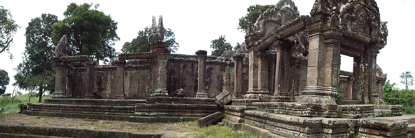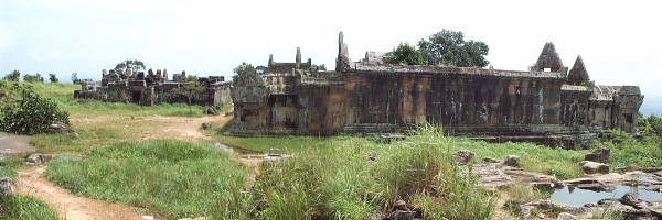 プレア・ヴィヒア(タイ名「カオ・プラ・ヴィハーン」)は10世紀から12世紀にかけて建造された神殿で、階段状に続く長い参道の左右にいくつかの楼閣を従えながら第1から第4までの神殿が直線的に並び、最後の第4神殿は標高657mの山上に位置しています。その規模は後日訪問するパノム・ルンに匹敵する素晴らしいもので、長年にわたりタイ・カンボジア両国で領有が争われていましたが、1962年に国際司法裁判所によって正式にカンボジア領と裁定されたという経緯があります。その後カンボジアの内戦でポル・ポト派の支配地に置かれたことから参拝が不可能となっていましたが、ようやく2年前(1998年)に旅行者にも解禁になりました。ただし神殿の周囲にはいまだに地雷が埋められており、ガイドなしに歩き回ることは危険。まさに映画『地雷を踏んだらサヨウナラ』の世界です。