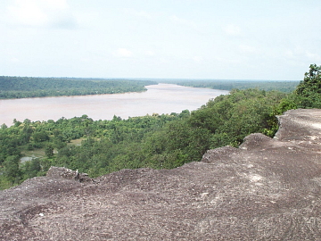 次にここから少し進んだところで、絶壁の上からメコン川越しにラオスの土地が望まれるパー・テムに到着しました。上から見るメコン川は意外に流れが速く、その茶色の川面にところどころ黒っぽい水が分離しているのはムーン川の合流点が上流の遠くないところにあるからです。右手の下流の方は広々とした大地が広がっていて、やがてこのメコン川はカンボジアを経てベトナムへと流れゆくことになります。島国である日本の川とは決定的に異なる、大陸の川の国際性を実感しました。