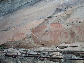 さて、岩の大地から右手に下へ続く歩道の入口があり、ここを下ると綺麗な砂岩の崖下に出ました。思わず見とれるほど見事に磨かれた岩の壁と岩の屋根(オーバーハング)の下に道が続いており、しばらく進むと壁面に先史時代の壁画が現れました。これは2000〜3000年前にこの地に住んだ人々による絵だと言われていますが、象・ナマズ・亀・手のひら・たくさんの壺が鮮やかな赤色で描かれていて見飽きることがありません。これらの絵は崖の中ほどの比較的高い位置に描かれていますが、その当時は川岸も今より高い位置にあったということなのでしょうか。