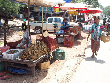車道を少し進むと、左下にラオス側の市場……といっても土産物屋を大きくしたものが軒を連ねているようなものでずいぶん静かです。置かれているものを見るとベトナムの物産が多い様子で、ゲート近くの免税店には元フランス統治下にあっただけあってワインが充実していましたが、もっとエキゾチックな土産を買いたいと思って物色した結果40バーツ(=120円)でラオス製のウイスキーを買いました。さらにゲートを通れば元来たタイ側の市場で、山盛りのランブータン、ラムヤイ、マンゴスチンなどの果物類が充実し、打って変わって大変な喧騒でした。