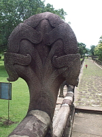 参道を進み、背中のウロコが妙にリアルなナークが飾られた手すりつきの階段を登って回廊をくぐると内院で、こちらは中央祠堂も赤い岩で作られていました。この中央祠堂は建物の規模も素晴らしく、入口の上を飾るレリーフの美術的価値も凄いものがあります。アンコール・ワットの壁面レリーフは全体に彫りが浅いのに対し、ここのレリーフはバンテアイ・スレイのそれと同様に深い彫りが特徴的。